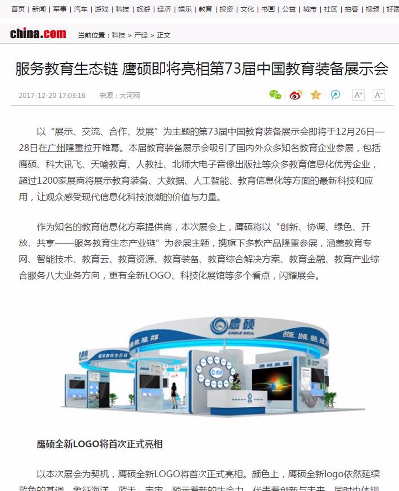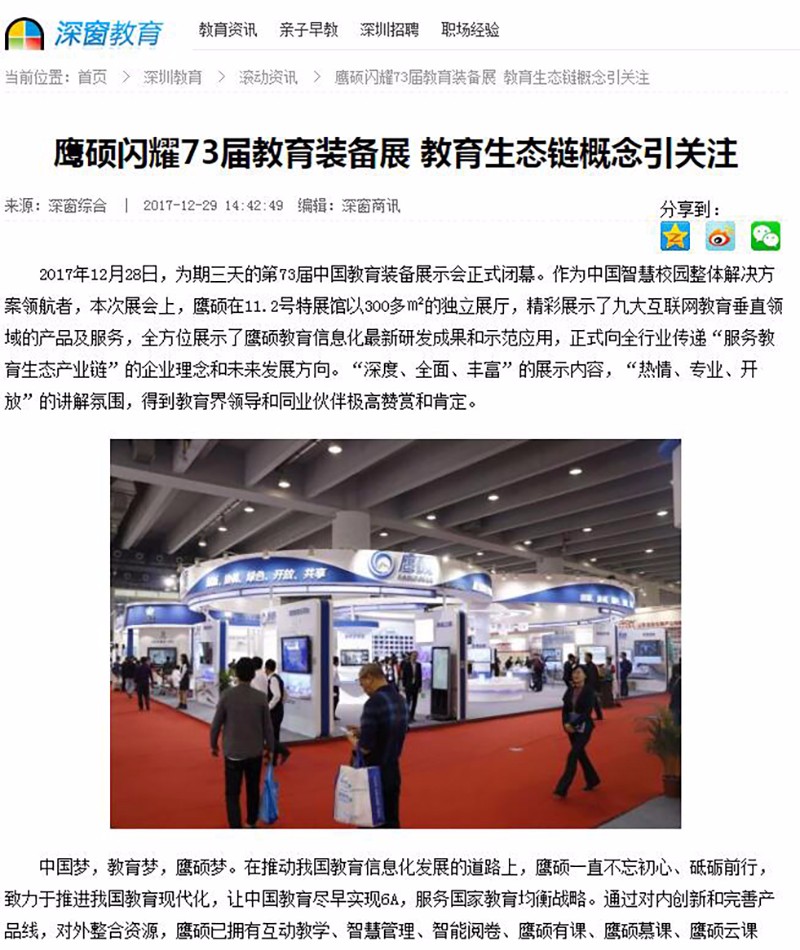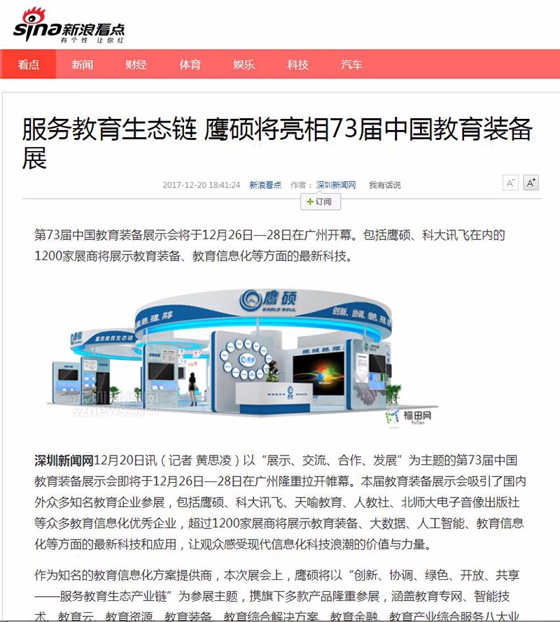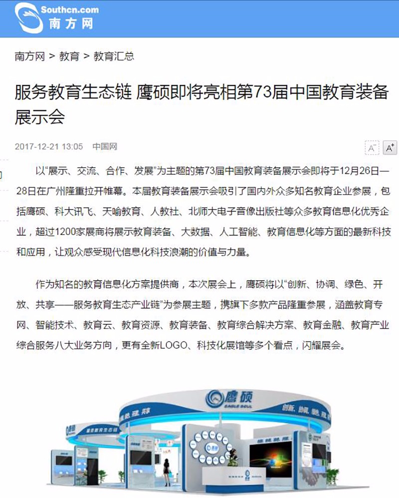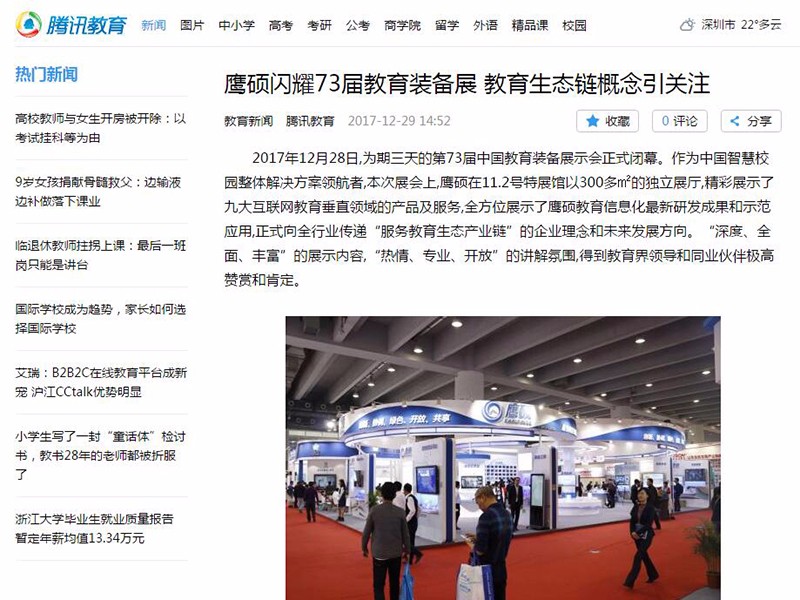 第73届中国教育装备展示会在琶洲展馆正式开幕,在本次展会上,鹰硕的教育生态链概念引关注,广东经常科教频道、云南经济日报、现代教育报、韶关日报、腾讯教育网、凤凰财经网、新浪看点、网易新闻手机端等均争相对此进行了报道。