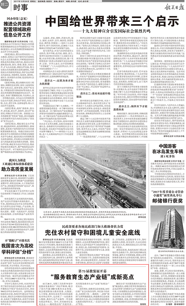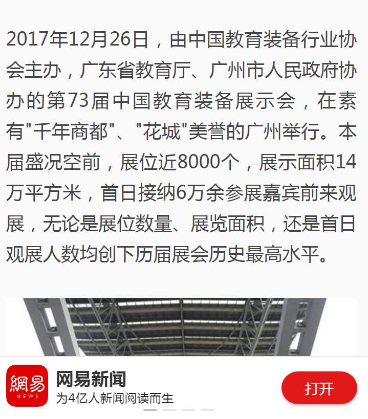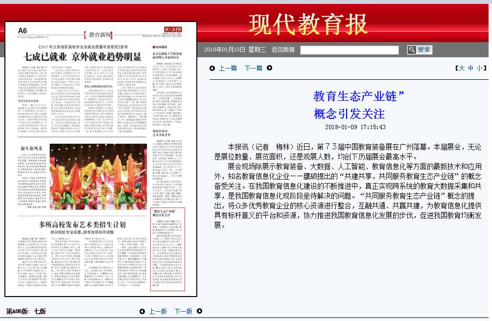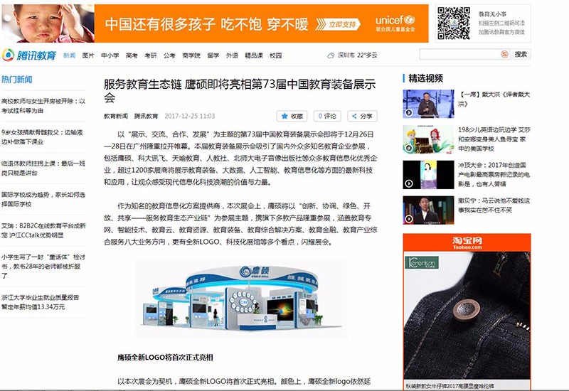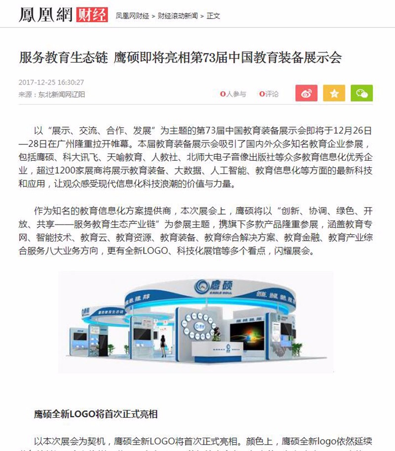 第73届中国教育装备展示会在琶洲展馆正式开幕,在本次展会上,鹰硕的教育生态链概念引关注,广东经常科教频道、云南经济日报、现代教育报、韶关日报、腾讯教育网、凤凰财经网、新浪看点、网易新闻手机端等均争相对此进行了报道。